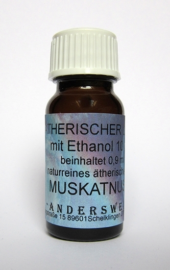 Ätherischer Duft Muskatnuß mit Ethanol, beinhaltet 0,9 ml naturreines ätherisches Öl und 9,1 ml Ethanol.