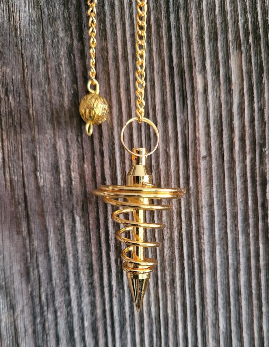 Pendolo a spirale di bella fattura in ottone placcato oro, con catena.